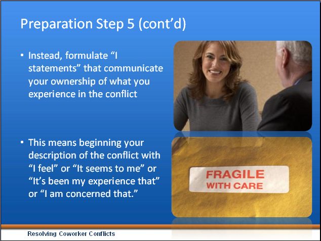 25. Formulate "I statements" that communicate your ownership of your part of the conflict